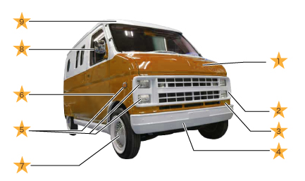 | 【フロントフェイスキット】 ¥300,000(税込価格 330,000円) オレンジ①~⑥(ボンネットカバー、フロントグリル、フロントパネル、フロントバンパースポイラー、ライト&ウィンカーキット、フェンダーパネル(L・R)) ※リア周り灯火類は別売りです。フロントグリル クロームメッキ加工60,000円(税込価格 66,000円) フロント&リヤバンパークロームメッキ加工 各50,000円~(税込価格 55,000円~) *上の写真3番目(イージーライダー ブラック)のリヤ廻りセット(VA用) 73,000円(税込価格 80,300円) *上の写真6番目(バモス イージーライダー)のリヤ廻りセット(バンパーガード付) 65,000円(税込価格 71,500円) |