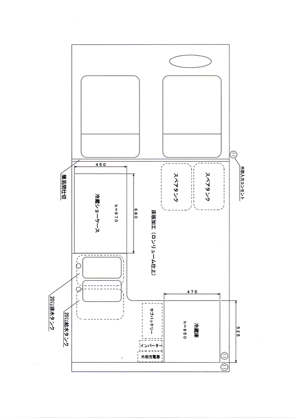 (例)水タンクの量、間仕切り、換気扇、シンクの大きさや個数等